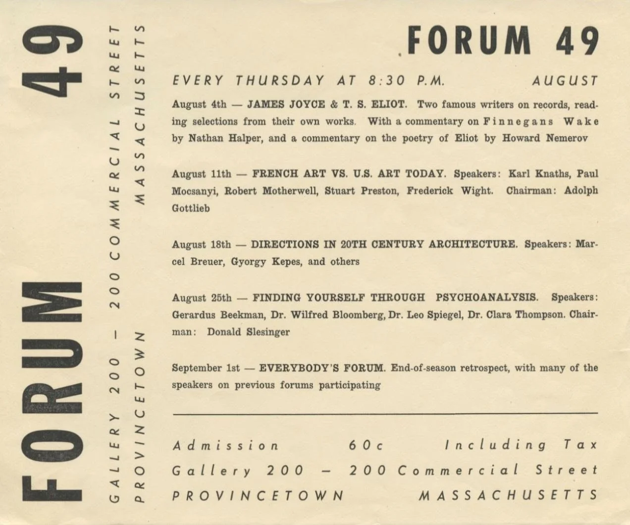"Forum 49 was a summer-long series of sophisticated programs held in 1949, beginning with the forum "What Is An Artist?" and ending with the controversial "French Art vs American Art Today." Record crowds attended the exhibits of paintings and programs focused on the avant-garde in many areas (architecture, psychoanalysis, poetry, jazz) all held in a gallery at 200 Commercial Street."
